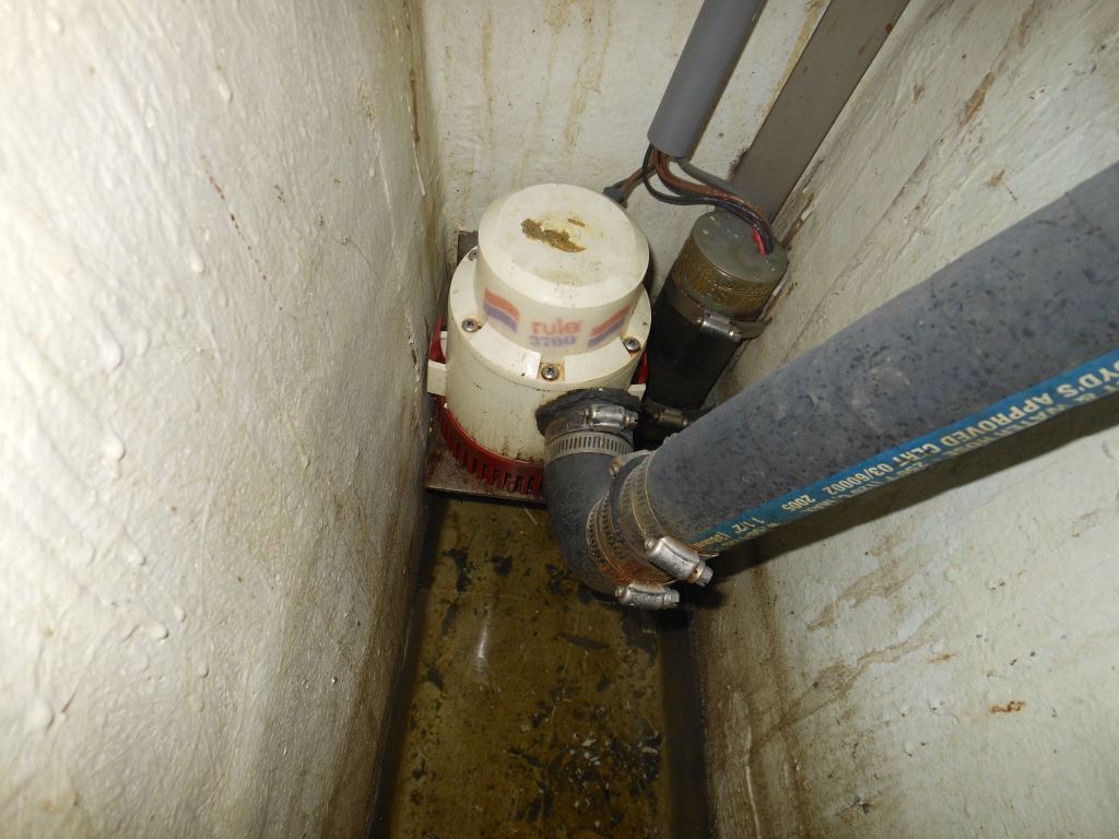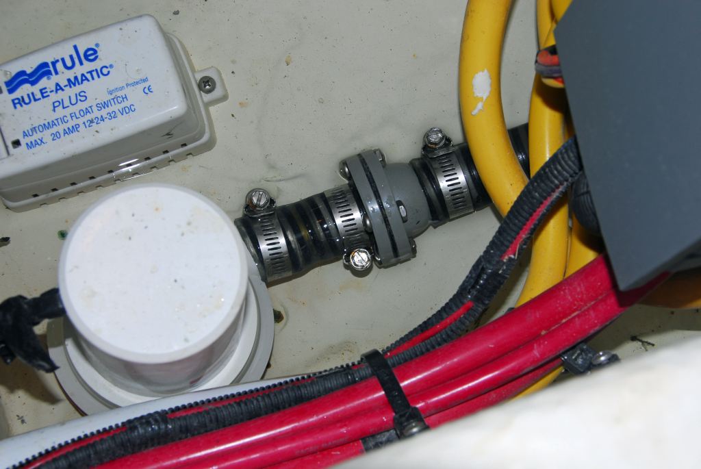 A large-diameter hose, a deep bilge, a submersible pump, and an in-line check valve (visible in the center of the image, retained by hose clamps) can be a recipe for failure.